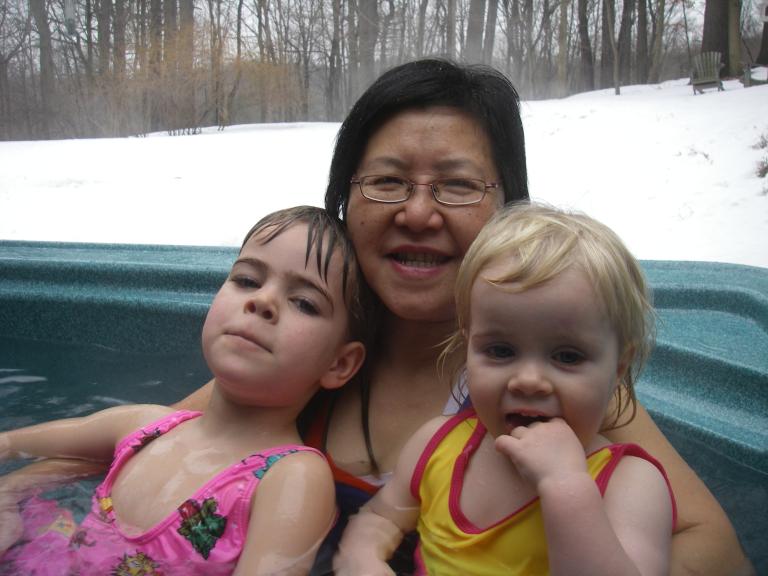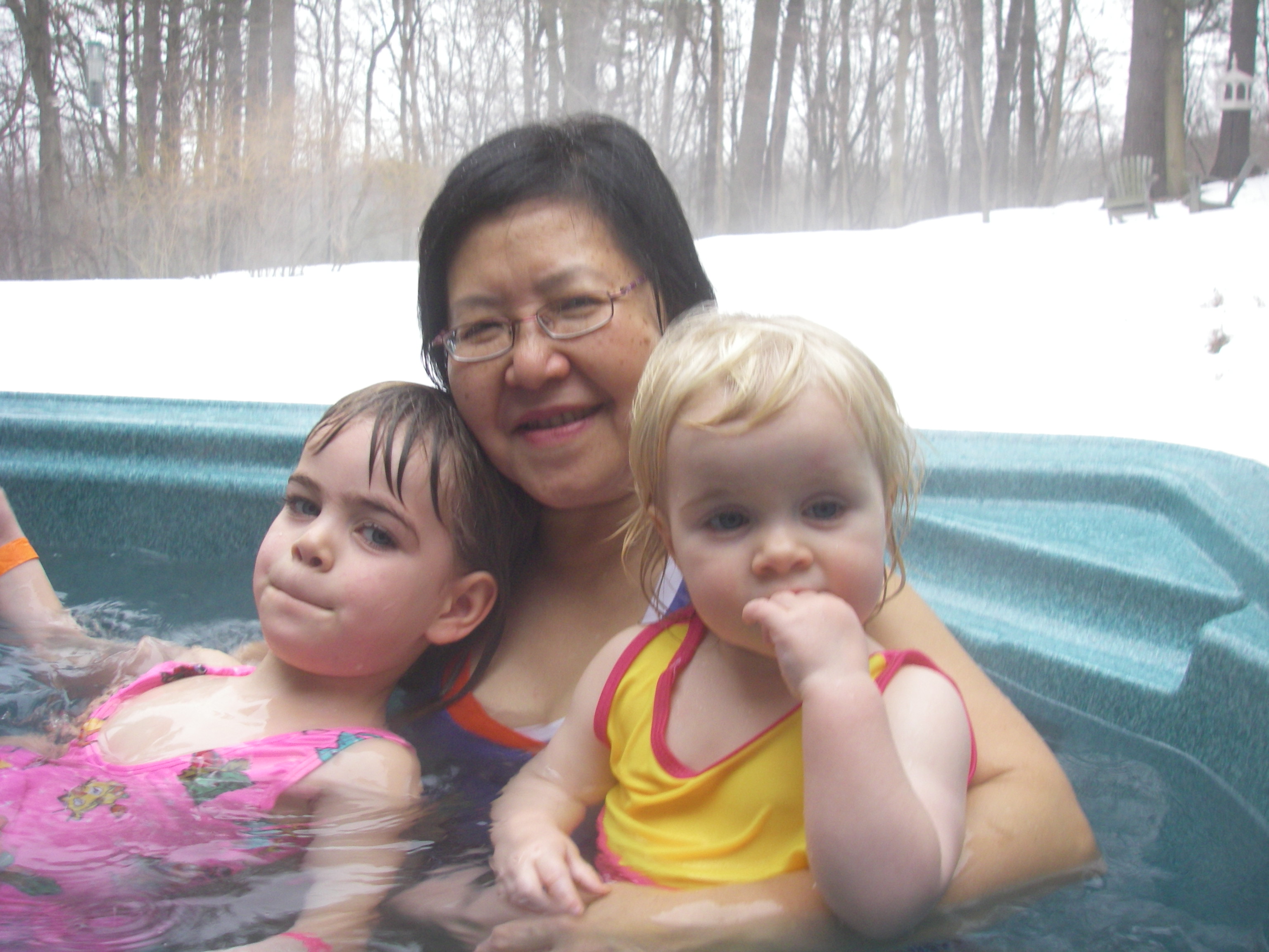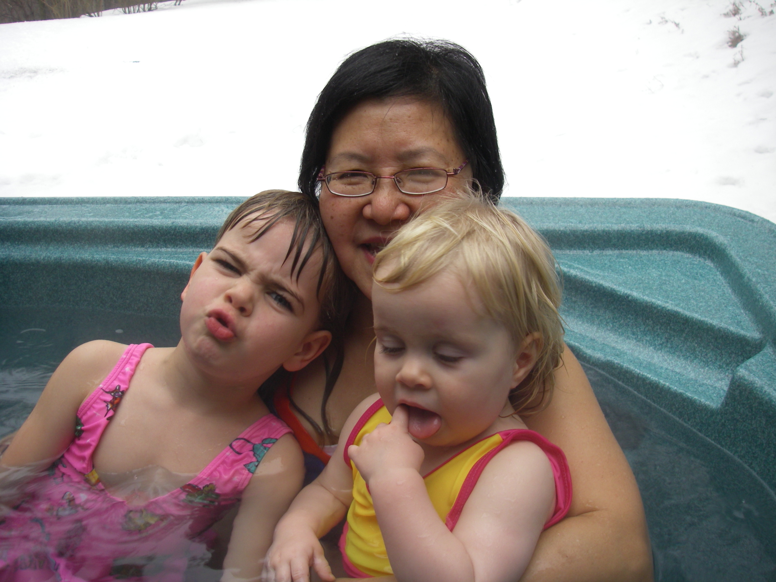 Christina and Daddy slithering in the snow: