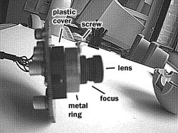 the camera interiour.All the parts you see now can be easily disassembled. Now that you can get a hold on the circuit board, read this warning by Michiel de Rond (michiel@rcd-net.com): "Be very carefull while opening the QuickCam!! Not only do you **VOID** your warranty by Connectix, you also risk damaging your cam (possibly beyond repair!!)" "After we had opened the quickcam, it sometimes yielded very bad images. These images contained excessive static and were in one word unusable. After a few days one of our team-members discovered that a very small SMD transistor had come off the cam while we had opened it. This device is about 1mm x 2mm, so this is easily overlooked." "This time it was possible to fix the cam, and we did manage, but you might damage the cam severely!" Author's comment: This happened with a colour qcam which has a lot more circuitry inside. While this page describes how to disassemble a black & white qcam, I was told by readers that disassembling a colour qcam is not very different. |