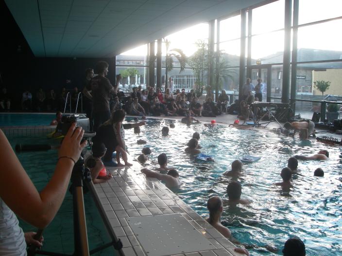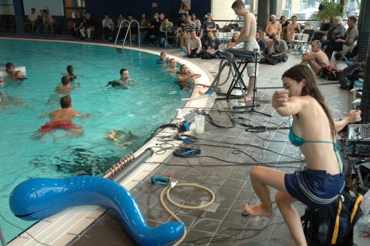 Some audience members immersed in water; some in air: