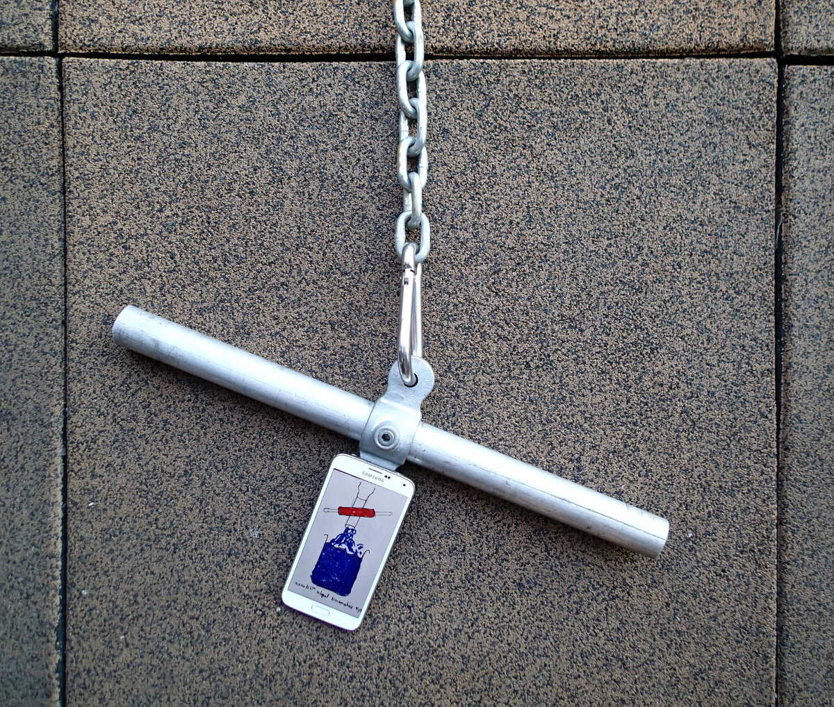 The fitness bar has a mounting bracket to which the user affixes a smartphone running the Mannfit app.